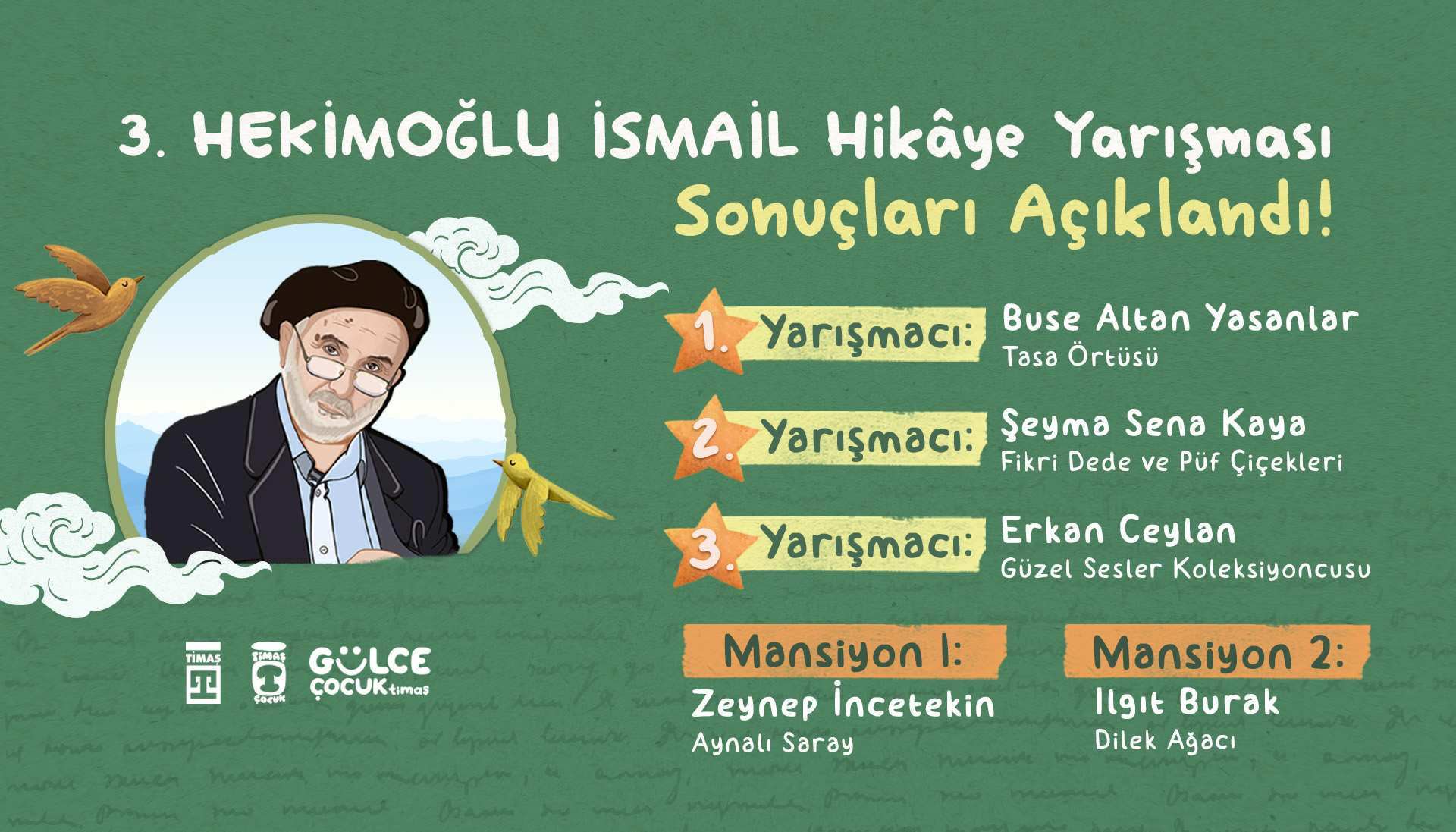 Çocuk edebiyatı için uzun yıllardır ürettiği nitelikli eserleri Türkiye’de ve dünyada çocuklarla buluşturmak için çalışan Timaş Yayın Grubu olarak, markamızın kurucusu Hekimoğlu İsmail adına gerçekleşecek hikâye yarışmasının üçüncüsünü bu yıl 1 Nisan 2025- 15 Ekim 2025 tarihleri arasında gerçekleştiriyoruz. Değerlerimizin işleneceği dosyaların değerlendirilip dereceye giren eserlerin ödüllendirileceği yarışmanın seçici kurulunda ise Abdullah Harmancı, Funda Uçuk Er, Merve Özcan, Metin Özdamarlar, Salih Uyan, Şeyda Apaydın bulunuyor.